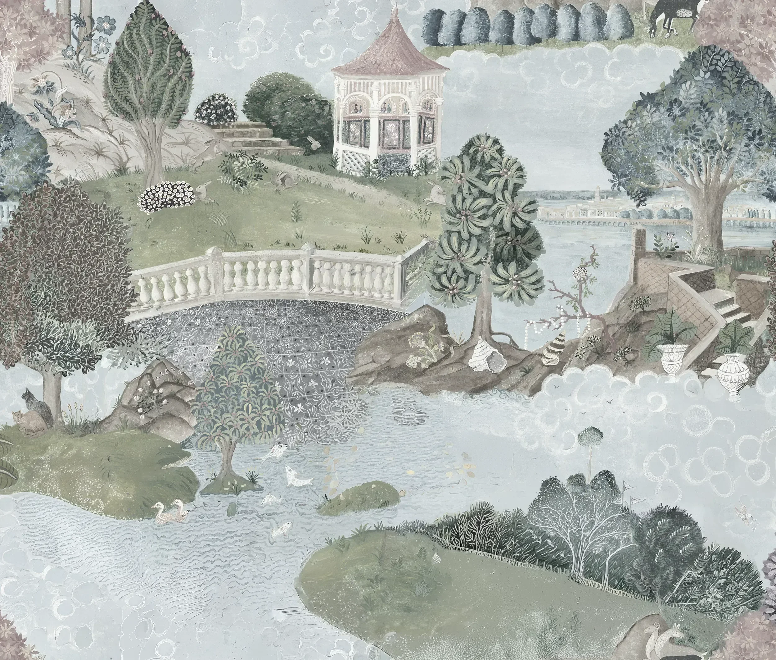 When Kit Kemp was invited to work her magic in a new collection, I was thrilled to come aboard as her co-designer. Having worked together on two scenic wallpapers for her Firmdale Hotels The Whitby and Charlotte Street we had developed a common creative language and we were eager to develop our ideas into a full fabric and wallpaper collection available to all.