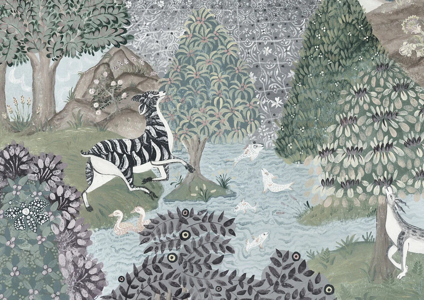 At the water's edge, a striking zebra-striped antelope ~ a Zantelope, if you will ~ leaps through a quiet clearing for a drink. Fish leap from the bubbling river, a pair of ducks drift by, and the wilder, forgotten areas of the garden press in on all sides.