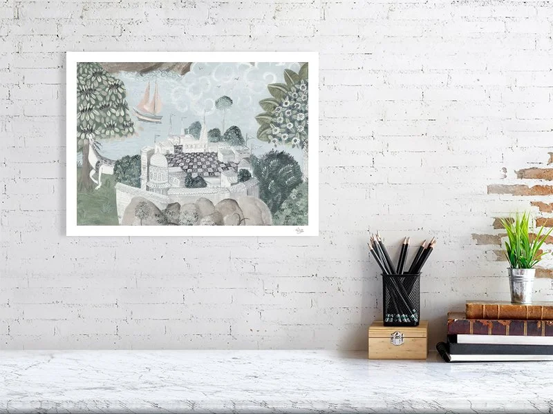 I painted this as part of the original Emily's Garden fresco secco, and in this print the Giclée process picks up every detail of the hand-painted surface: the chalky texture of the ground, the fine brushwork of the architecture, the subtle irregularities that only come from paint applied by hand.