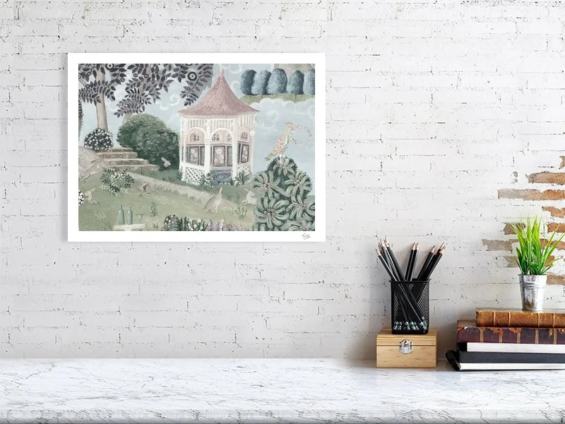 A delicate ornamental folly serves as the focal point for the garden's social life. Its pink shingled roof and arched windows invite you to explore inside. In the foreground, a gathering of rabbits rest and play on the lawns. At the foot of the composition, a single goblet sits among the lavender as though set down and forgotten.