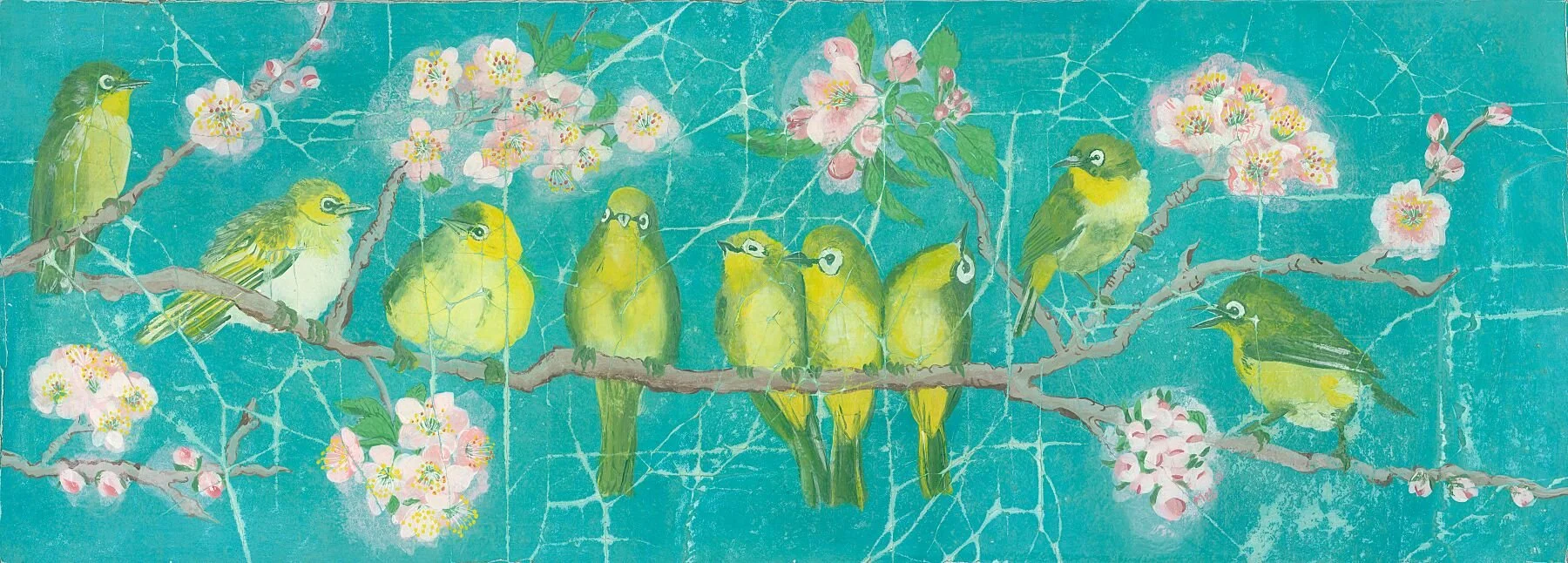 A lively gathering of Silvereyes, known by their Māori name tauhou, perched amidst a delicate branch of cherry blossom. Set against the deep, atmospheric blue of an Oceanian sky, these tiny citrus-yellow birds are captured in a chattering row of excited plumage.