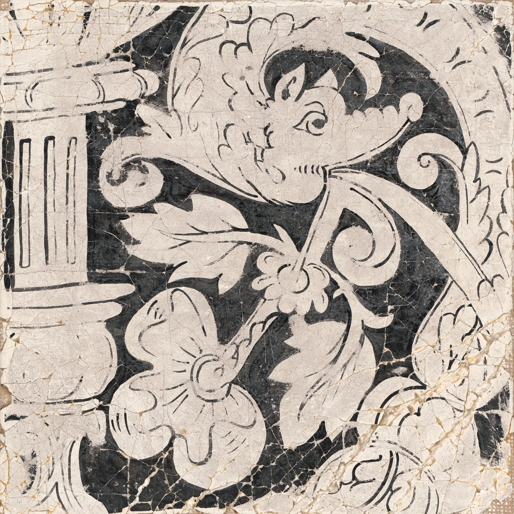A classical column gives way to a dense, looping multivine: one of the hallmarks of Elizabethan interior decoration. At the heart of this square-format grotesque composition is a fantastical dragon, depicted spewing a celebratory trail of leaves and flowers. This piece is a distillation of a design tradition I have spent thirty years researching and reproducing for heritage sites and historic houses, including Stiffkey Old Hall in Norfolk.