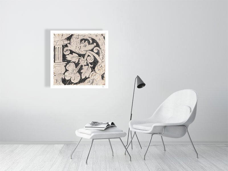 I chose to present this in charcoal and ivory to let line, form, and history speak for themselves. The high-definition print captures the worn, rubbed-back texture of an original Tudor wall painting: the surface that only accumulates through genuine age or genuine craft.